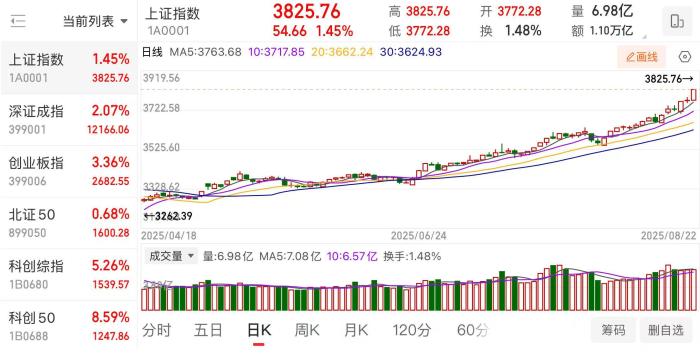 8月22日,A股上涨,沪指突破3800点,再创10年新高。